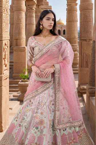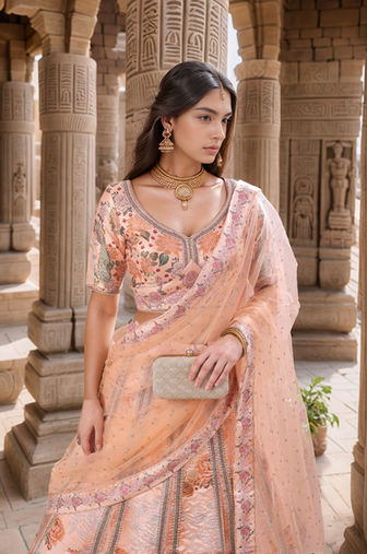 The symmetrical and majestic design evokes the royalty and elegance of heritage sites such as Jaisalmer Fort or Amer Palace, making it perfect for showcasing traditional or ethnic fashion in a regal, luxurious setting.