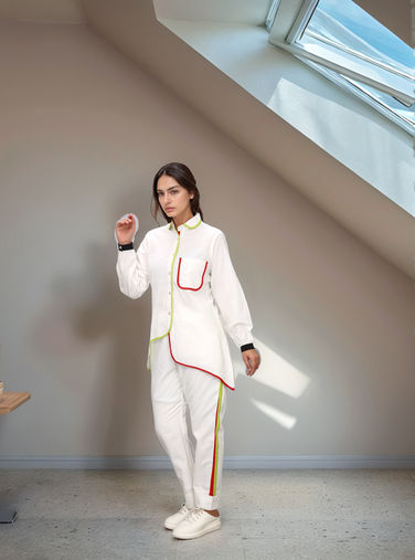 The background features a modern, minimalist interior located under a sloped ceiling, likely in an attic or loft space. A large skylight window allows natural sunlight to stream in, casting angular shadows on the clean, light-colored walls and terrazzo flooring. The simple decor, lack of clutter, and soft lighting give the space a calm, contemplative feel — perfect for intimate portraits or editorial-style fashion photography.